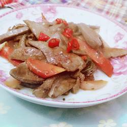 7.Put oil in a pot, heat ginger, sauté pepper until fragrant, add pork liver and stir-fry
