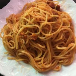 2. After the pasta is cooked, remove it and set aside.I bought a 100g package of pasta sauce from the supermarket.I put half of the package in.According to personal preference Flavor put.Put it in the pot and stir-fry it first