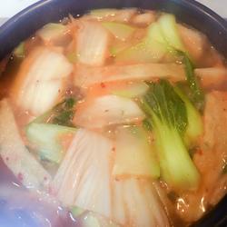 6.Start putting the ingredients, add spicy cabbage, melon fish cakes, pollack put into a.