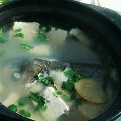 3.Put an appropriate amount of cold water into the casserole, put the fish head and tofu, ginger slices, pepper and Put a spoonful of salt into a casserole and bring to a boil.