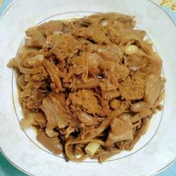 After soaking the baked bran in water, squeeze out the white foam several times; It tastes better if you add some black fungus and shiitake mushrooms to the plain stir-fry