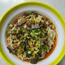3.Put the noodles into a bowl, pour the prepared juice over them, and sprinkle with chopped peanuts, diced beef, and chopped green onions.