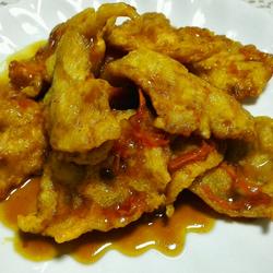 8.Pour in the fried meat slices and stir until the meat slices are evenly coated with the sweet and sour sauce and serve