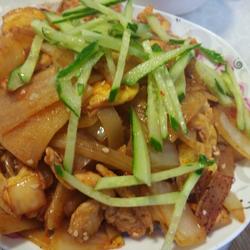 7. Add a little oil, onion, and chicken to the pot and stir-fry, add cut cold noodles, pour in the prepared soup, collect the juice and take it out of the pot