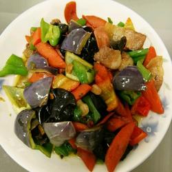 5. First stir-fry the carrots and fungus, and finally add the green, red and purple peppers After frying in the pan, add salt, sugar, and chicken essence, stir-fry evenly, and serve on a plate.