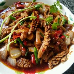 5. Heat 90% vegetable oil in the pot, add diced red pepper and Sichuan peppercorns , onions, ginger and garlic into the pot and saute until fragrant, then add the pickled kidneys!