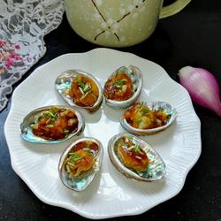 9. Oyster sauce is poured on the abalone meat Top, sprinkle with green onions on each one