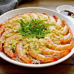5. Remove the soaked vermicelli, drain the water and spread it on the bottom of the plate.Place the prawns on top of the vermicelli.