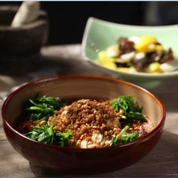 5.Add cooked noodles, crushed peanuts, pea tips, and processed Minced pork, a steaming bowl of Sichuan dandan noodles is ready to serve.
