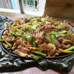 8. Place the iron plate on the gas stove, heat until almost red, pour in Add a little peanut oil, fry the onions on the iron plate, and add the fried beef!