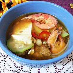 13.Add the shrimp and cook for a while, then add the green onions, red peppers, onion slices, pork belly, and shiitake mushrooms and continue cooking