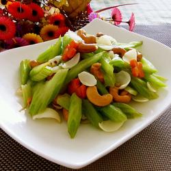 2. Heat hot water in a pot, blanch cashews for 1 minute, drain and fish out Set aside.Add a small amount of oil and salt to the pot.Blanch the celery and carrots for 1 minute.Remove and set aside.