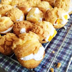 14. Beat the light cream with sugar, squeeze into the cooled puffs, you can also add some of your favorite fruits, here I added diced mango