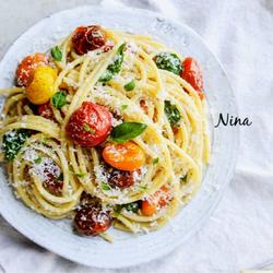 Garlic pasta with roasted cherry tomatoes Recipe
