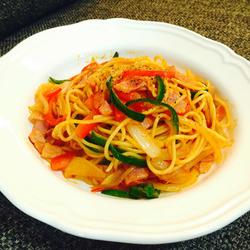8. Stir-fry for a while, add the cooked noodles, and stir-fry evenly with some tomato sauce
