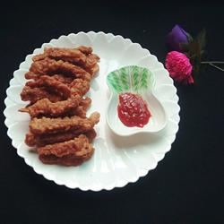 4. Pour oil into the pot and heat it to 60% heat.Pour the batter-coated meat into the oil and fry (it is not easy to fry once, so do it several times)p>