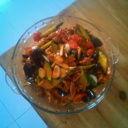 4. Saute garlic slices, add cucumber, persimmon, fungus, meat slices, add seasonings and stir-fry Remove from the pan.