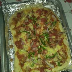 2. After the pizza is baked, apply pizza sauce, pizza grass, black pepper, sprinkle with a layer of shredded cheese, and cut it All the ingredients are placed on top