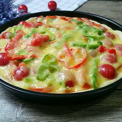 1. Preparation materials: shred green and red peppers and onions, ham Slice the intestines and cut the cherry tomatoes in half
