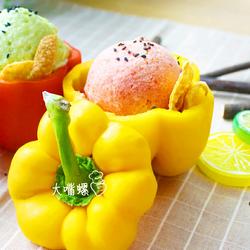 13. Use an ice cream scoop to scoop out the frozen ice cream into a ball shape and pack it into a ball.Pour into colored peppers, garnish with yuba and enjoy (yuba! Hualuo bag bag bag bag bag bag bag~)