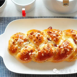 16.Cut the large almonds into pieces Crush it, mix it with pearl sugar and sprinkle it on the surface of the bread.Bake it in the preheated oven.In the last five minutes, check the coloring.If you are satisfied, cover it with tin foil to avoid excessive coloring