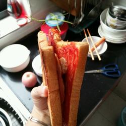 3. After cutting the ham, you can also put it on the pancake stall and fry it for a while , and then put it on the piece of bread with tomato sauce.The amount of ham sausage depends on the individual, it can be more or less.