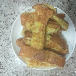3. Cut the bread into slices and then into strips, then put the eggs into the bread strips liquid.