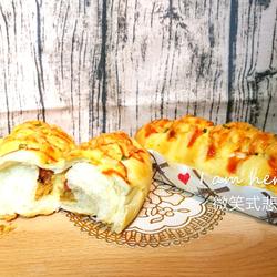 4. After rolling everything, put it in the oven with two bowls of boiling water and let it ferment naturally until it doubles in size.Take it out and brush it with egg wash, squeeze on tomato sauce, salad dressing, and sprinkle with grated mozzarella cheese.Sprinkle with chopped green onion.