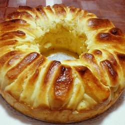 9.Put it into the hollow mold! I used an eight-inch removable bottom mold.I found a high-temperature-resistant bottle in the middle and wrapped it with tin foil instead.I put it in the oven for secondary fermentation at 30 degrees for 40 minutes.Put a bowl of boiling water in the oven to increase the humidity and ferment until it doubles in size!