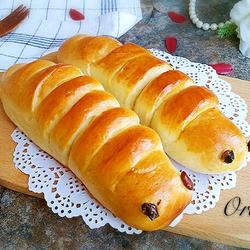5. Roll the dough into an oval shape, spread it with jam or bean paste, I use It is homemade cherry jam.Cut the lower part into a one centimeter wide strip without cutting it off.Start rolling the jam from one side to the end, and it will become a furry body