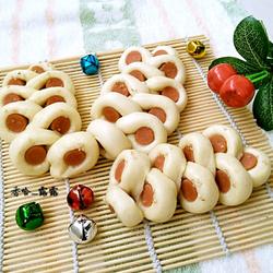 6.Take a piece of dough and roll it into an oval shape and put the ham sausage in it