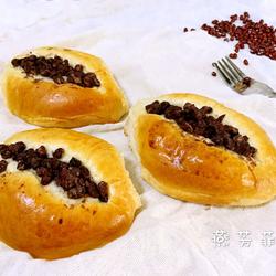 15. Use a bag cutting knife to cut the bread embryo in the middle, keeping the integrity of both ends.Add red bean paste in the middle and sprinkle powdered sugar on top of the red bean paste.