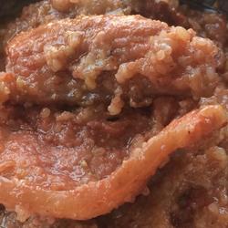 6.Add the finely chopped glutinous rice into the pork belly, mix well so that each piece of meat is coated with minced glutinous rice, and marinate until the minced glutinous rice turns red;