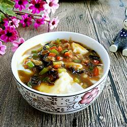 10. At this time, the tofu brain has solidified and formed, pour the prepared meat marinade on top.
