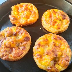 1. Thaw the purchased egg tart crust, brush it with tomato sauce, put on grated cheese, put on your favorite fruit, and put a layer of grated cheese