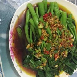 4.Sprinkle the sauce on the kale, burn a ladle of vegetable oil and pour it on the sauce