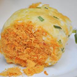 7.Turn over, sprinkle the ugly side with meat floss and salad