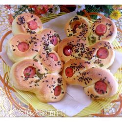 9.Take a small ball of dough and roll it out, put the ham sausage on the rolled out dough
