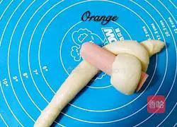 7.Continue to knead longer, cut the ham in half, and place it on the curved surface, leaving a little space on it