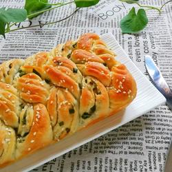 3. Roll the dough into a cake shape, spread a layer of pastry on the surface, and sprinkle a layer Chop the scallions and roll them up.