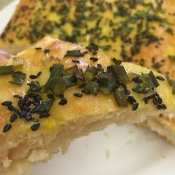 5.Sprinkle egg wash on the dough Chopped green onion and black sesame seeds