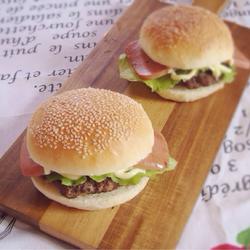 12. Cut the burger embryo in half, add beef patties, lettuce, and ham slices, squeeze on the salad dressing, and cover with another piece of burger embryo, and it's done!