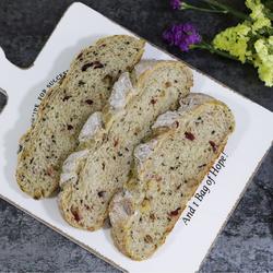 5. Continue kneading for about 20 minutes, and add cranberries when there are 5 minutes left.Knead dry, black sesame seeds and chopped walnuts until evenly combined.