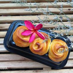 14.Make all the small ingredients into roses and brush them on each flower Apply a layer of egg wash and place in a baking pan.