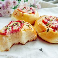8. Brush the bread with egg wash, put a piece of ham on it, squeeze on the salad dressing and sprinkle with chopped green onion and it's ready
