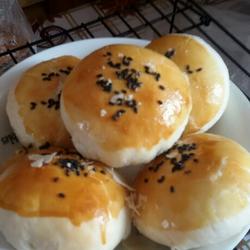 7. Roll it into a round shape, add fillings, and flatten slightly.Brush with egg wash and sprinkle with sesame seeds.