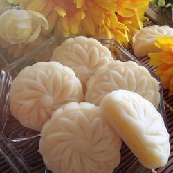 11. Dip your hands in powder, flatten a portion of the ice skin and wrap it in the custard filling.While turning, push up the ice skin, gradually seal it and make it round.