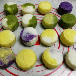 5.If you like one color, use one color.If you like two colors together, fold the two doughs together and wrap them with fillings.Use a mooncake mold to press out the pattern.