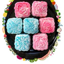 8.Put the wrapped mooncakes into the mold, press it tightly, and tap it gently, the snowskin mooncakes will fall out of the mold.I used two colors of skins and two patterns of molds to distinguish between bean paste filling and sesame filling.