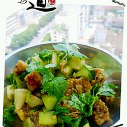 5.Put coriander, cucumber and lotus root together and add a little salt (mooncakes have their own salty taste) ), chicken essence, sesame oil, minced garlic and mix well.